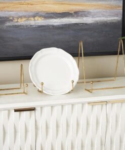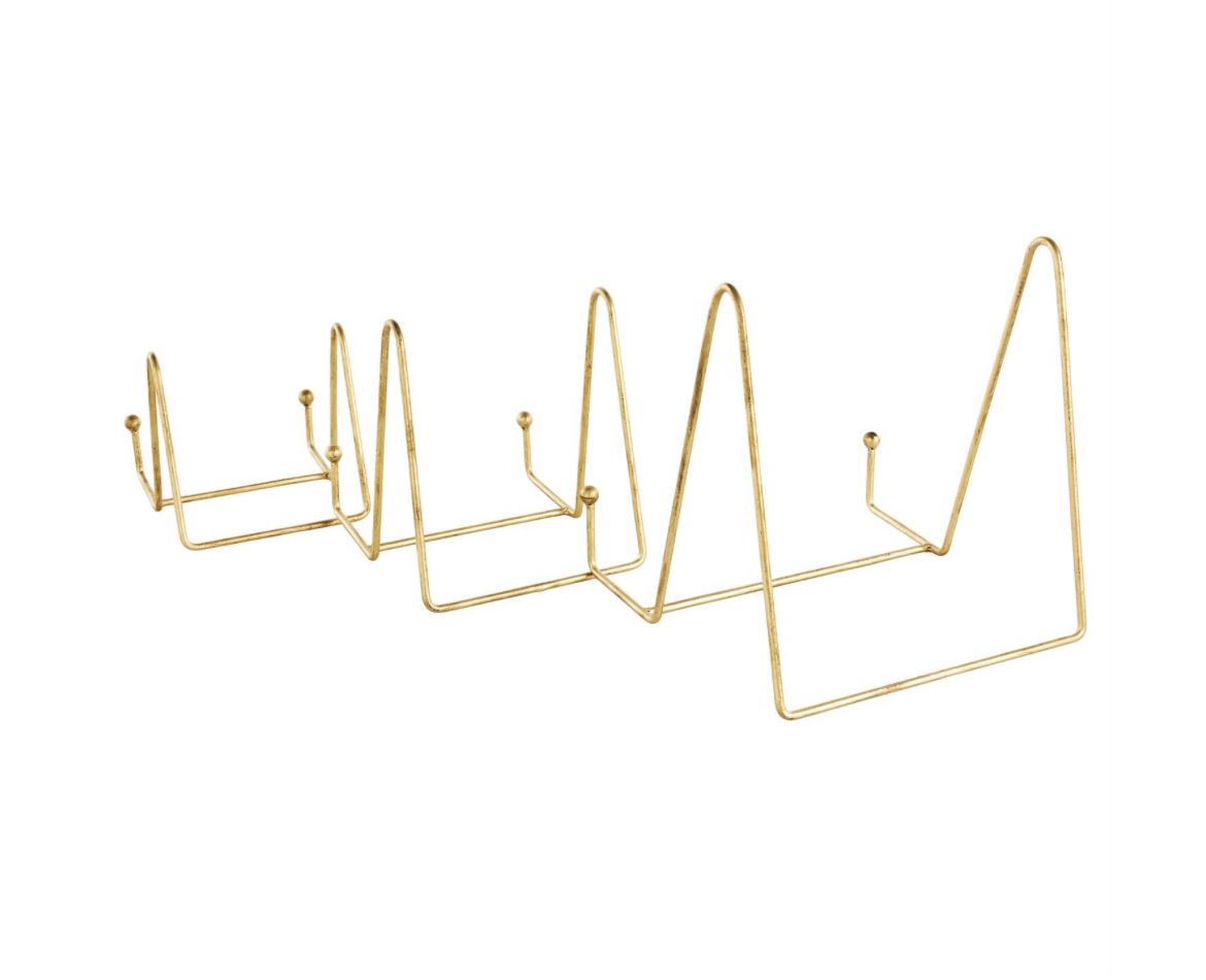 La amplia forma triangular de este caballete decorativo dorado mate presenta tapas arqueadas y detalles de bolas en cada extremo, lo que agrega un estilo contemporáneo y geométrico a su exhibición.