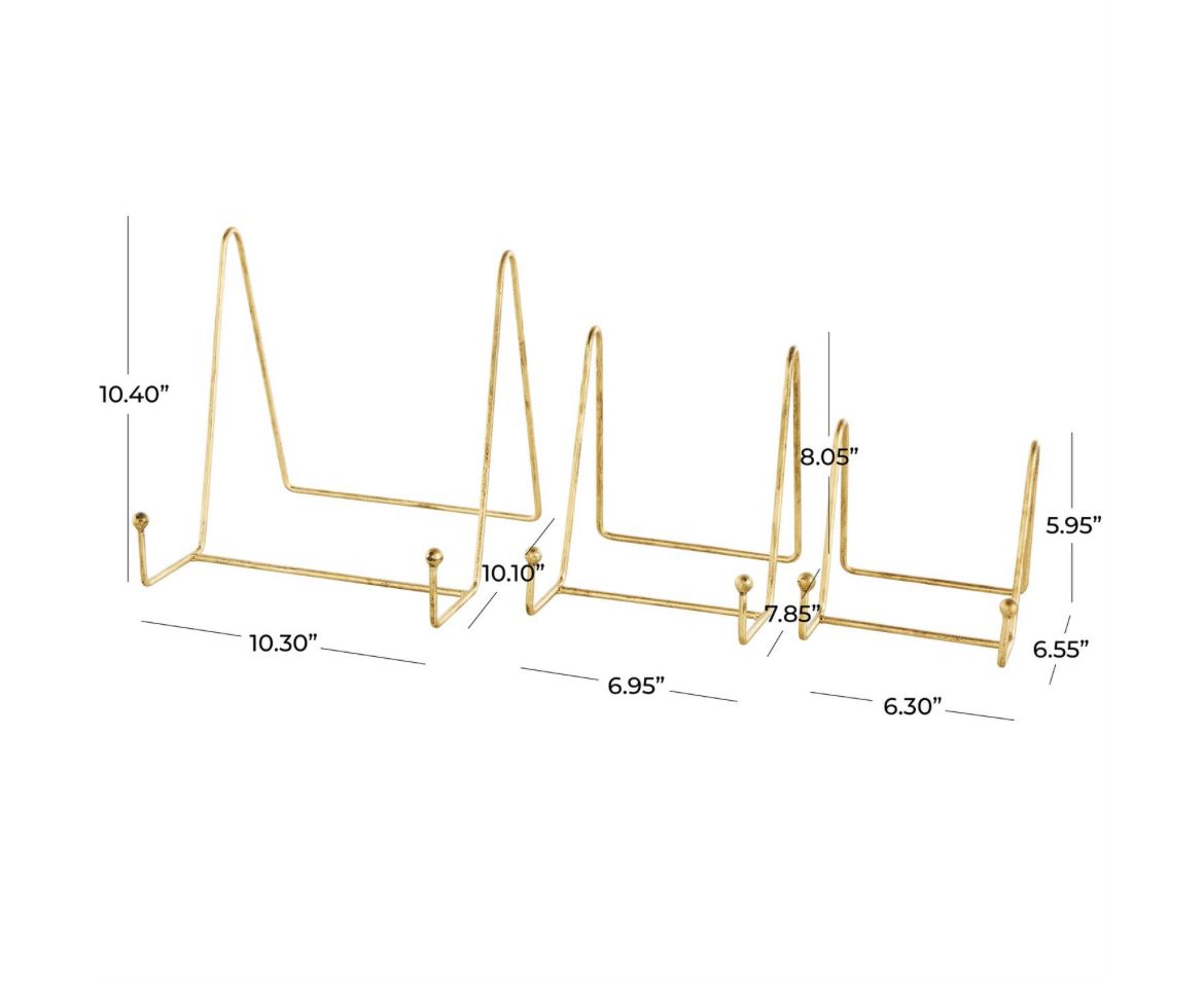 Cada caballete de metal dorado mide 6 pulgadas de largo x 7 pulgadas de ancho x 6 pulgadas de alto, 7 pulgadas de largo x 8,50 pulgadas de ancho x 8,25 pulgadas de alto, 10 pulgadas de largo x 10 pulgadas de ancho x 10 pulgadas de alto, y en conjunto pesa 2,33 libras.