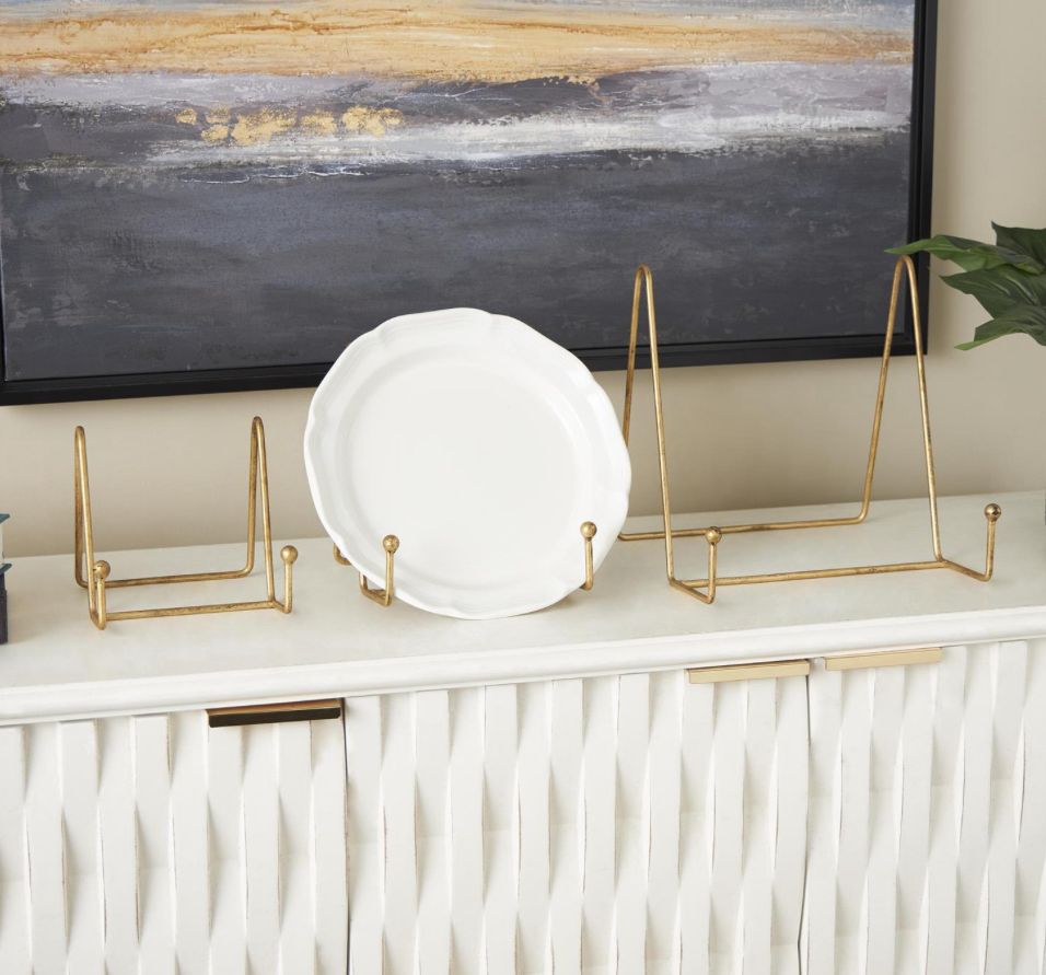 Diseñado con un perfil amplio y minimalista, el juego de hierro de 3 caballetes proporciona una solución de exhibición estable y elegante para su decoración o arte, creando un arreglo estético.