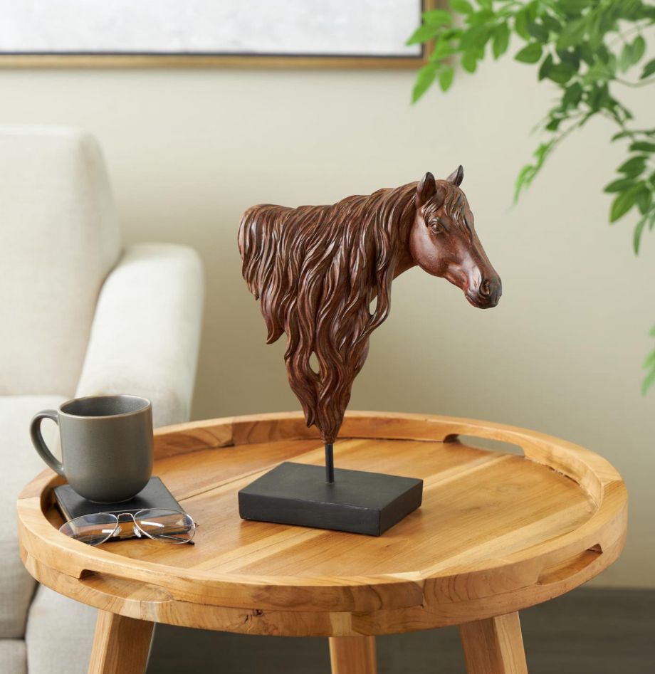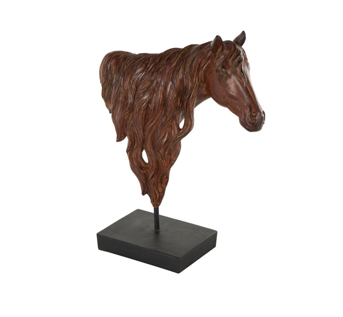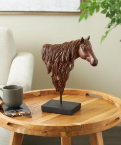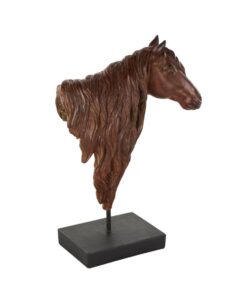 La brillante escultura de color marrón oscuro captura la forma majestuosa de una cabeza de caballo sobre una base cuadrada.