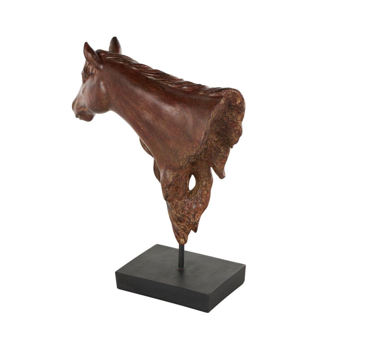 La escultura decorativa de caballo presenta un acabado marrón oscuro desgastado con una base negra.
