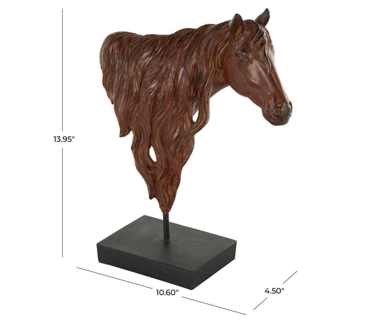 15949Escultura decorativa de cabeza de caballo de cerámica marrón oscuro con base rectangular negra, 28 x 12 x 35 cm