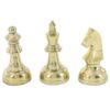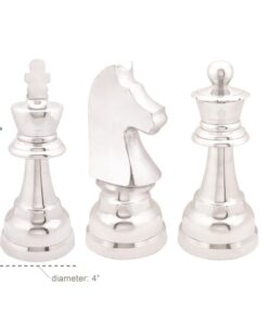 Este juego de ajedrez plateado está hecho de aluminio para una exhibición liviana y duradera. Grandes estatuas de piezas de ajedrez de rey, caballero y alfil con acabados plateados metálicos brillantes y reflectantes.