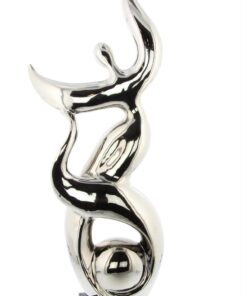 Información adicional importante: Esta escultura está realizada con materiales cerámicos muy brillantes, sobre una base de mdf. Esta elegante escultura viene en un acabado plateado pulido.