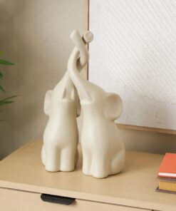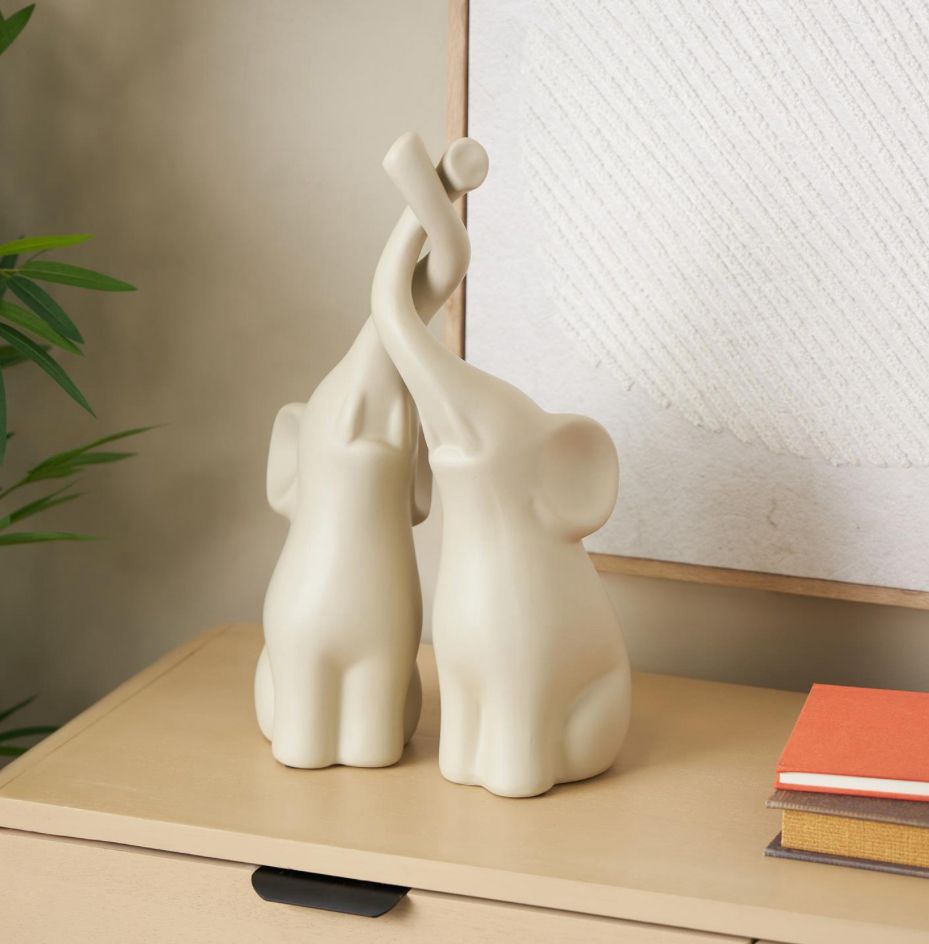 Este conjunto contemporáneo de 2 estatuas decorativas está moldeado con material cerámico, tiene forma de figuras de elefantes y está pintado con un color crema, lo que demuestra una artesanía experta.