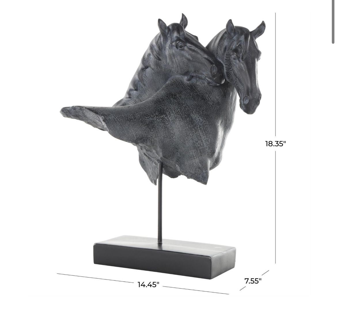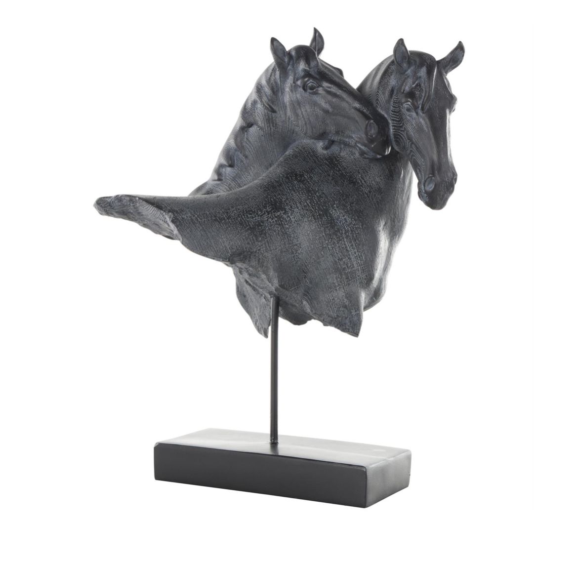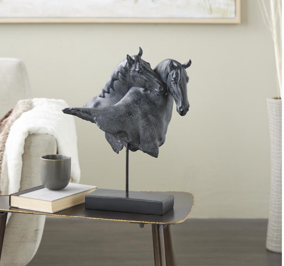 Esta estatua con acento de granja fue moldeada cuidadosamente con resina en un diseño de cabeza de caballo superpuesta doble y luego recubierta con un acabado negro mate para mayor profundidad.
