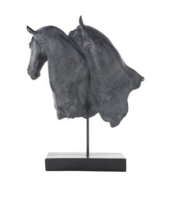La figura decorativa para el hogar en negro mate presenta dos cabezas de caballo realistas con formas elegantes y patrones intrincados, elegantemente colocadas sobre una base de bloque rectangular.