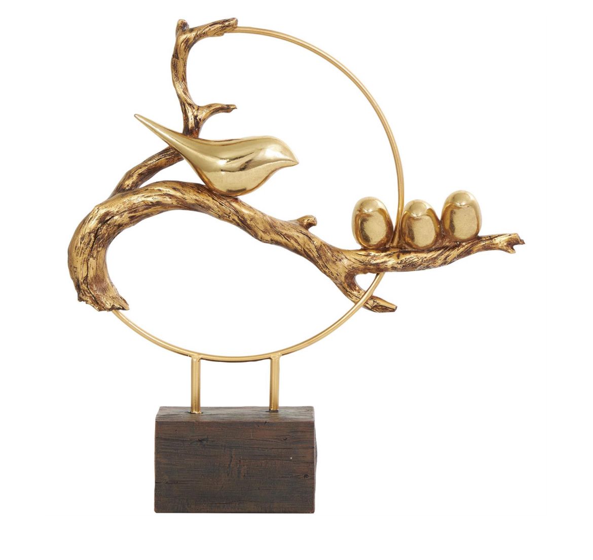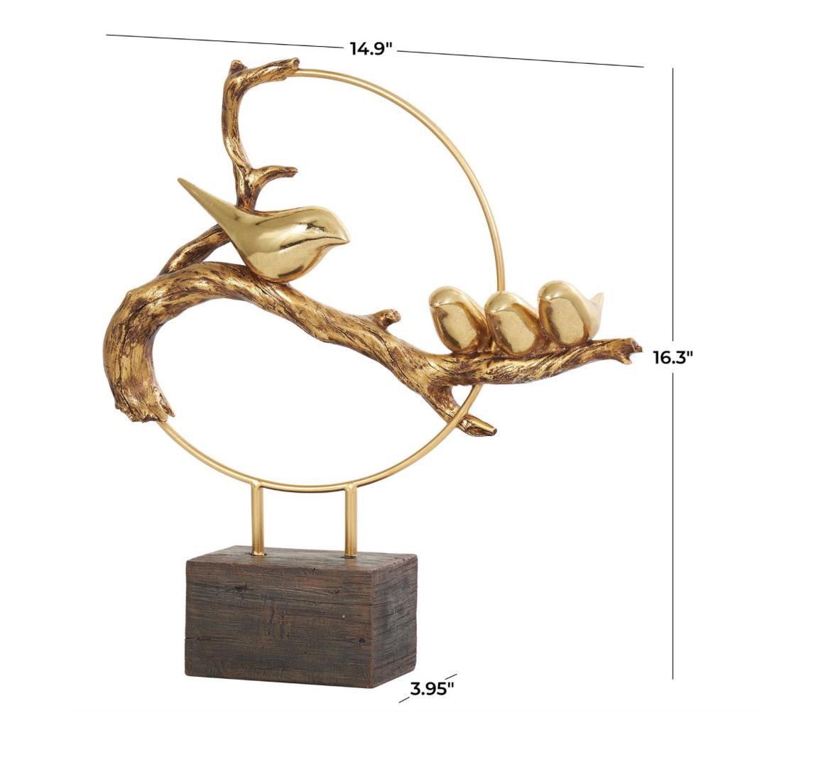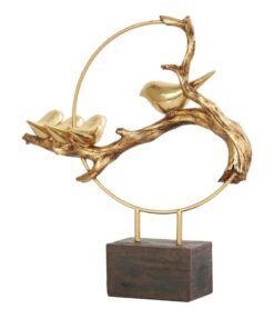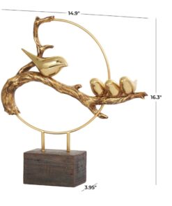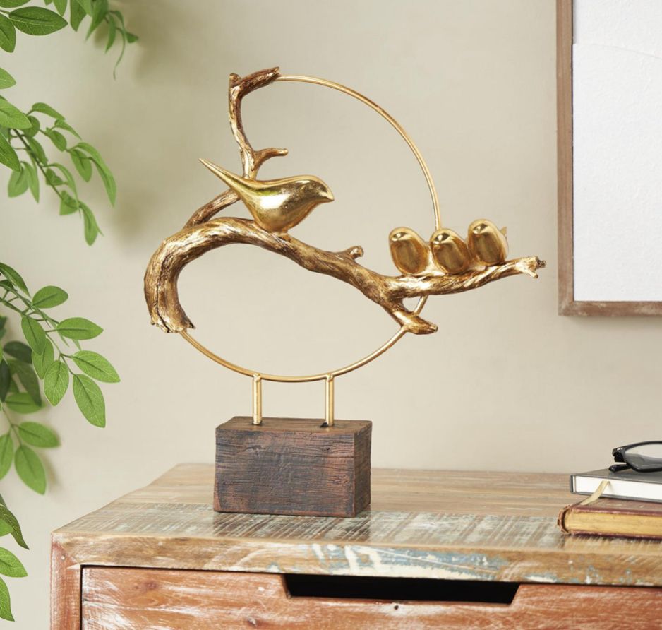 La representación de una familia de aves en una rama en esta figura decorativa para el hogar hecha de oro pulido forma un patrón dinámico que captura la esencia de los lazos familiares y la belleza de la naturaleza.