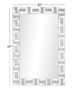 Información adicional importante: Vidrio de alta calidad, material MDF y mosaico de nácar, el espejo de pared plateado refleja una imagen clara y precisa, cuenta con un magnífico acabado plateado espejado, incrustaciones de mosaico crema y un marco texturizado y adornado con rectángulos en relieve y un patrón de mosaico, el espejo de pared de plata pulida presenta un aspecto moderno pero atemporal.