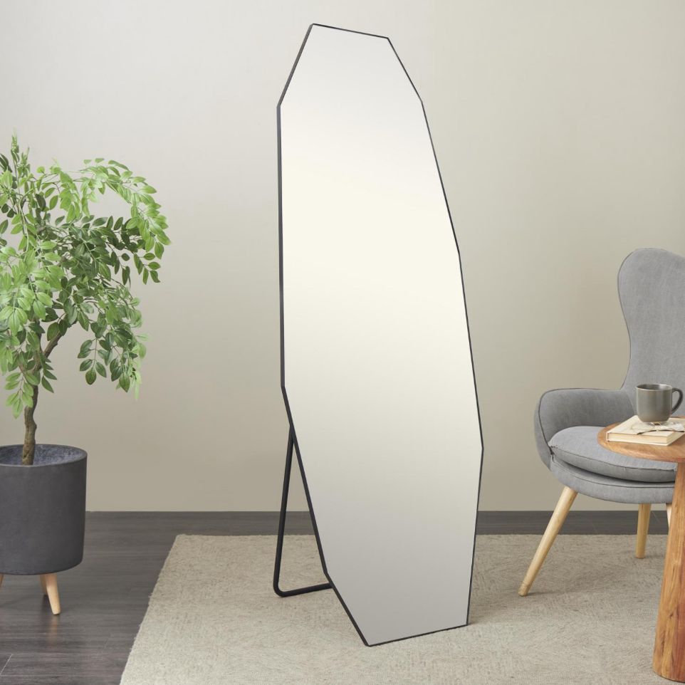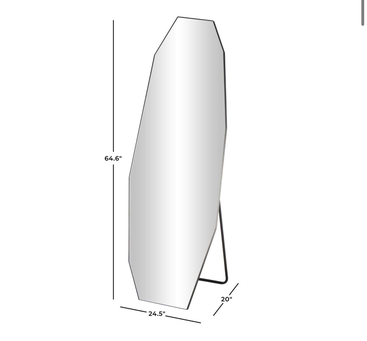 El espejo de piso de metal negro mide 24,5L x 20W x 64,6H pulgadas y pesa 24,5 libras.
