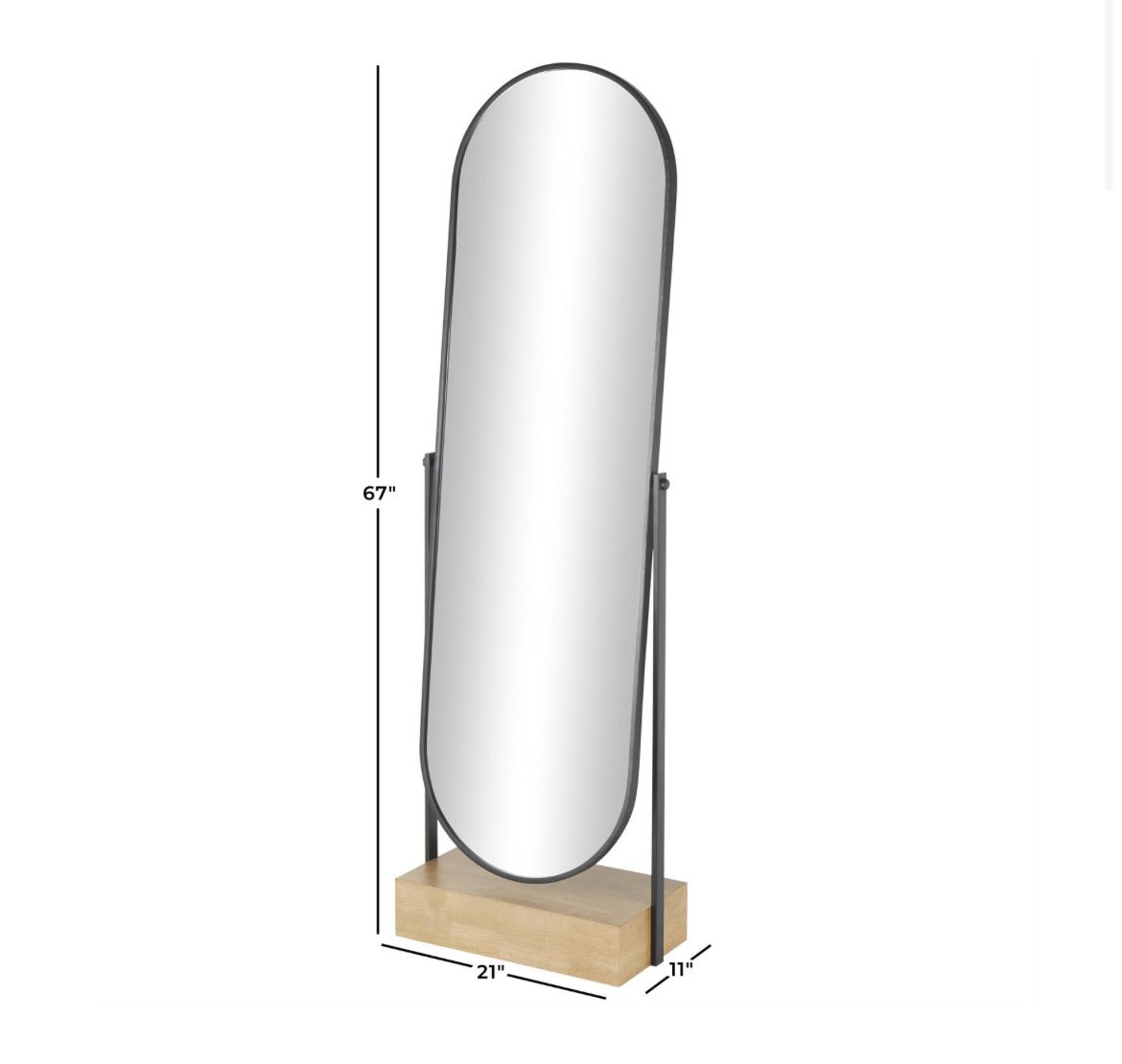 El espejo de piso de madera negro mide 21L x 11W x 67H pulgadas y pesa 38 libras.