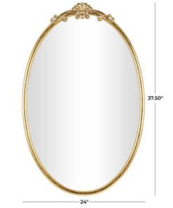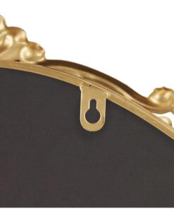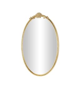 Leve descripción del producto: Espejo de pared en forma ovalada con diseño en la parte de arriba en tono dorado.