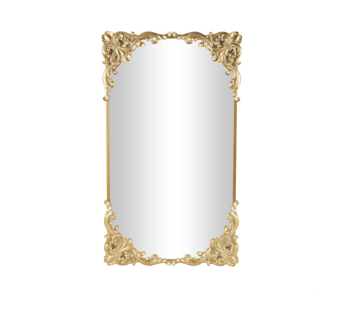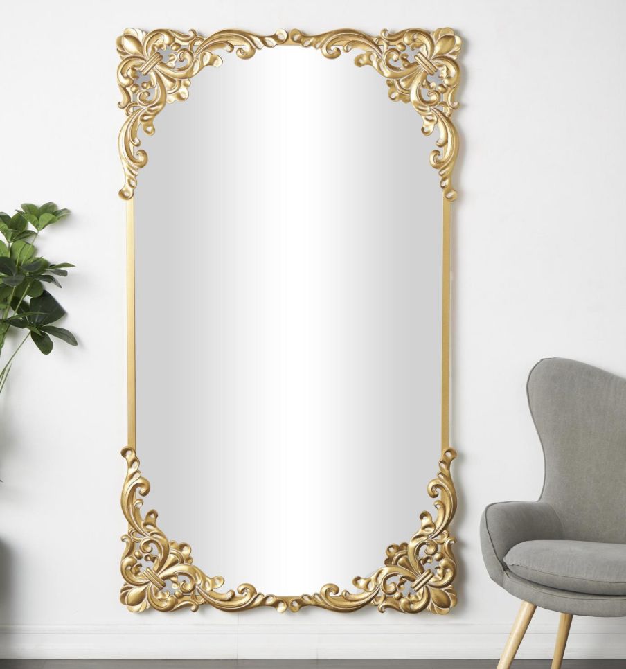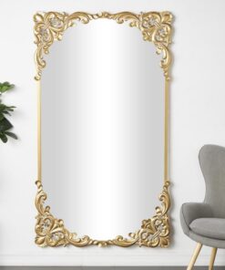 Un espejo de piso que cuenta con una llamativa forma rectangular, bellamente complementada por un patrón ornamentado que baila a lo largo de su superficie, exudando un encanto elegante que eleva sin esfuerzo cualquier espacio.