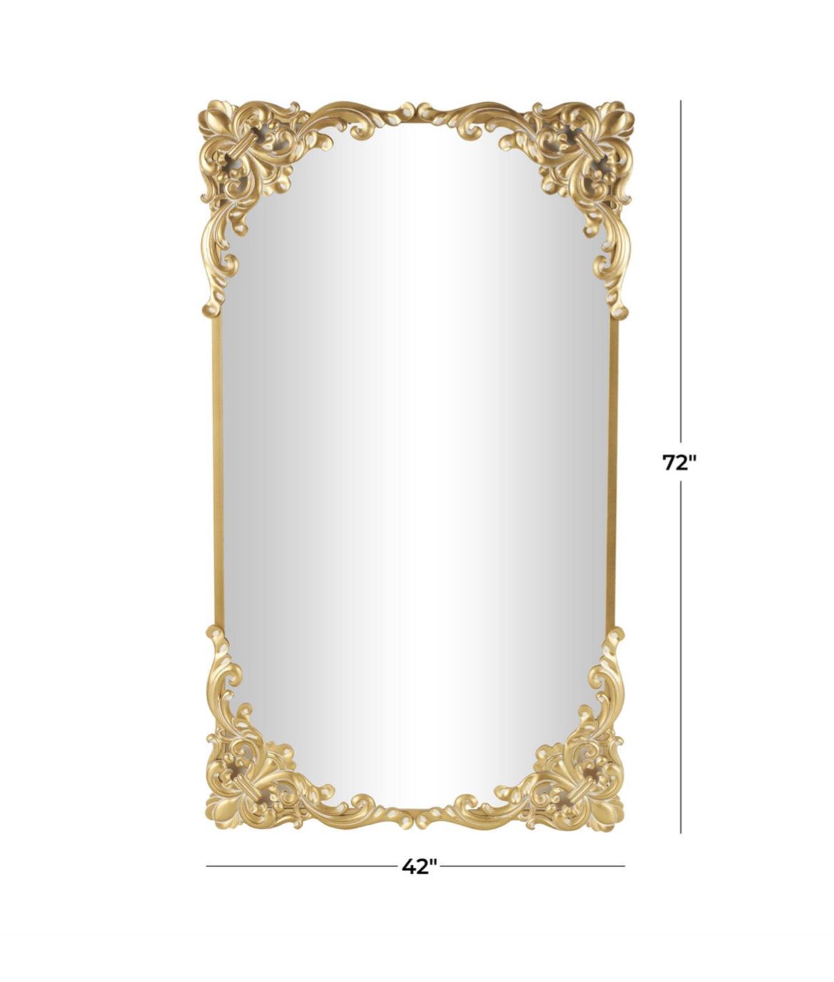 El espejo de piso de metal dorado mide 42L x 2W x 72H pulgadas y pesa 54 libras.