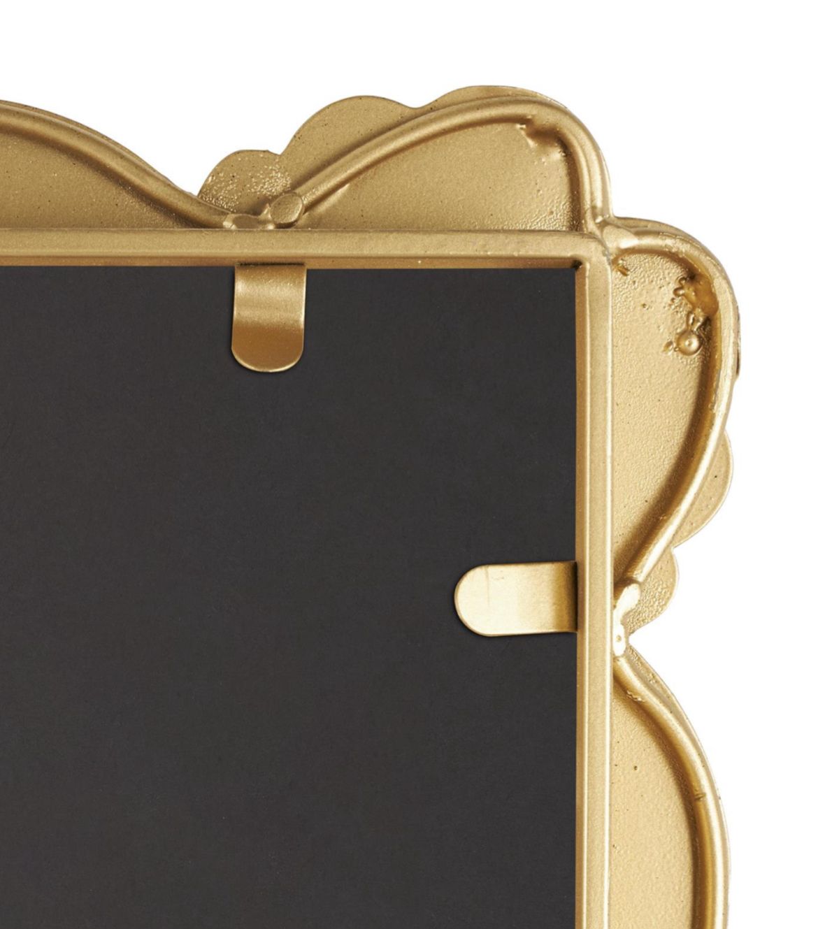 Espejo de piso alto, barroco, ornamentado y con volutas de metal dorado.