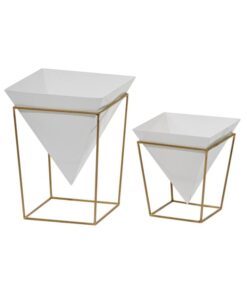 Leve descripción del producto: Juego de 2 macetas en forma triangular blancas con dorado
