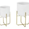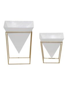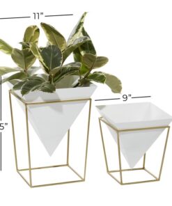 Información adicional importante: Sólida construcción de hierro para mayor durabilidad, destaca un acabado de maceta en color blanco margarita con soportes para macetas dorados metálicos de forma geométrica que cuentan con una maceta con punta triangular y un soporte de metal cúbico de estilo abierto.