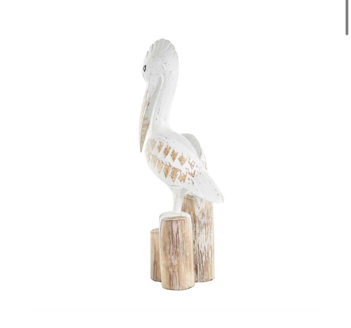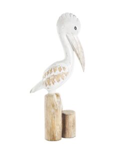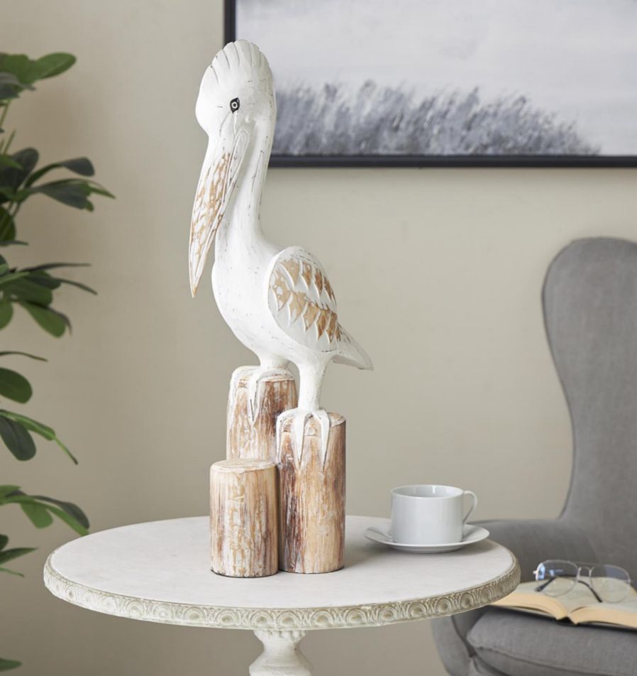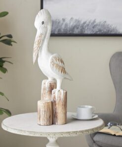 El juego de estatuas decorativas de pelícano presenta un acabado blanco desgastado con postes marrones, que encarnan un encanto náutico y una estética relajada, La escultura de madera blanca mide 6,5 pulgadas de largo x 12 pulgadas de ancho x 24 pulgadas de alto y pesa 2,815 libras.