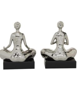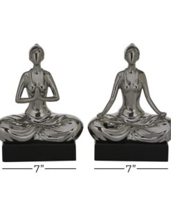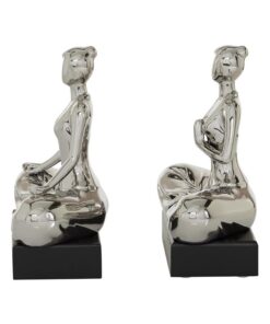 Leve descripción del producto: Set de esculturas de yoga en tono plata con base negra de madera