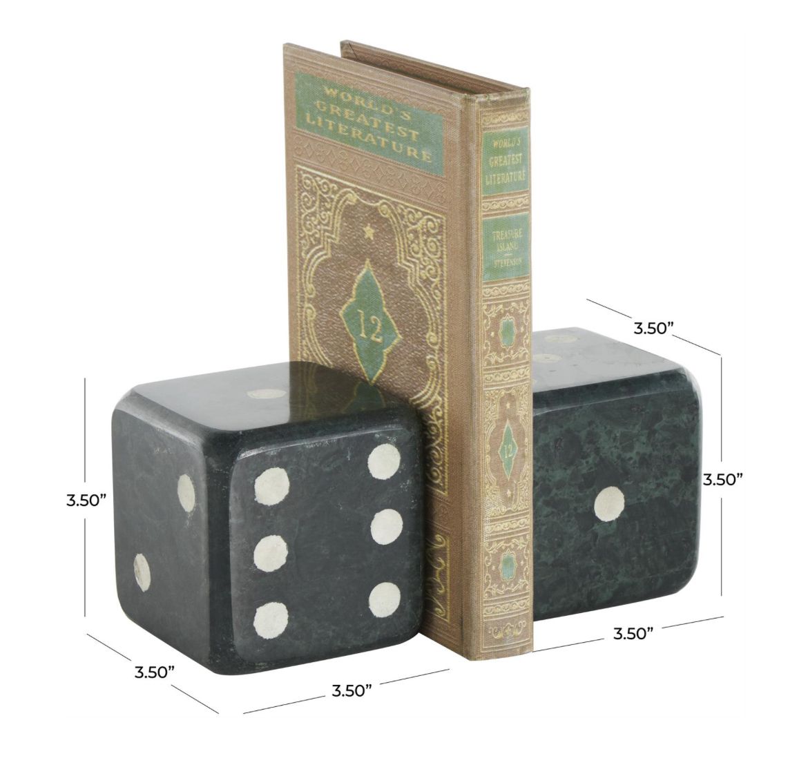 Cada sujetalibros de mármol verde mide 3,50 de largo x 3,50 de ancho x 3,50 de alto, 3,50 de largo x 3,50 de ancho x 3,50 de alto pulgadas y pesa colectivamente 9,0 libras.
